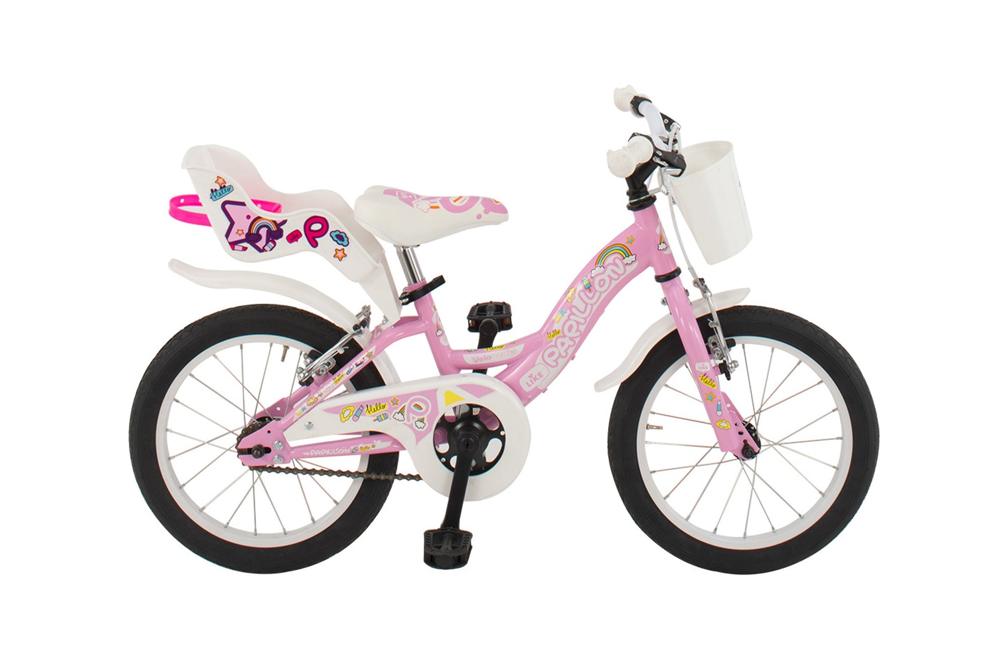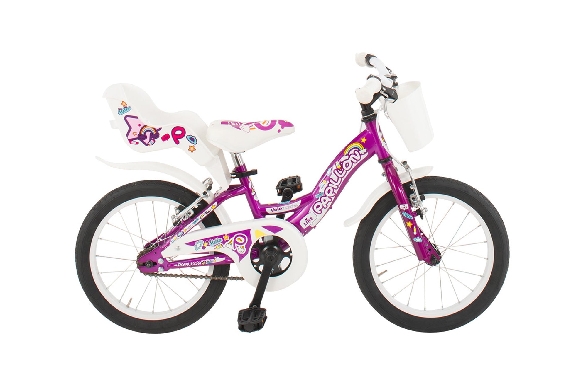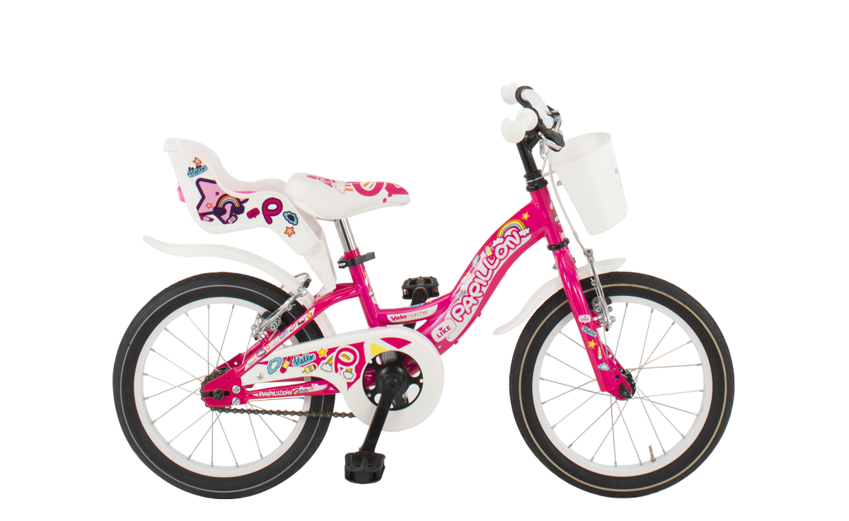 La bicicletta da bambina Papillon 16” senza marce marchiata Velomarche è progettata per le bambine che vogliono imparare ad andare in bici come i grandi mantenendo un aspetto estetico femminile e vivace.