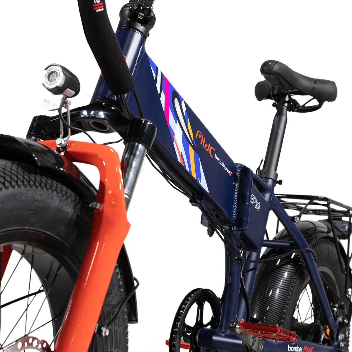 Équipé avec Cadre pliable en aluminium de 17" Et Roues 20" , Bomber MWC offre des émotions de piste à chaque utilisation. De très hautes performances avec le puissant Moteur 250W et le Batterie au lithium 48V 10Ah intégrée au cadre , qui permet une autonomie d'environ 60 km *, sans négliger le facteur de sécurité apporté par freins à disque et amortisseurs .